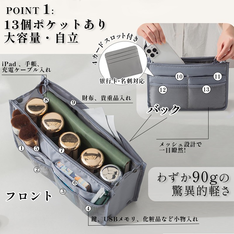 - (Lightweight, Large Capacity, Freestanding) Weighing only 3.2 oz (90 g), it is surprisingly light enough to fit in a tote bag. There are 13 pockets that can be sorted (3 large and 10 small). Two large anti-theft zipper pockets can safely store your wallet and important accessories, and the 10 small pockets neatly organize your smartphone, keys, pens, business cards, handkerchiefs, etc. It has a large capacity design that can fit your iPad, making it perfect for organizing your belongings when commuting to work or on business trips