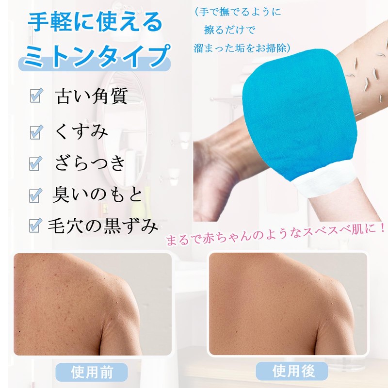 - (Comfortable Stimulating and Relaxing Effect) This is an authentic scrub set that can be done at home. Mainly used in rough areas such as knees, elbows, and heels. Provides comfortable coverage on arms, back, hips and feet. The fine fibers stimulate skin and promote blood circulation, remove pores and exfoliating stains, keeping skin clean. Enjoy a luxurious relaxation free from your busy life