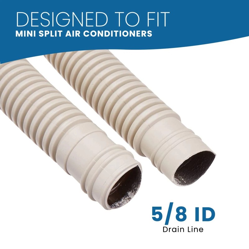- UNIVERSAL 20-FT DRAIN HOSE FOR MINI SPLIT AC & HEAT PUMPS – Designed to efficiently channel condensate away from your system, this 20-foot drain hose provides ample length for flexible installation.