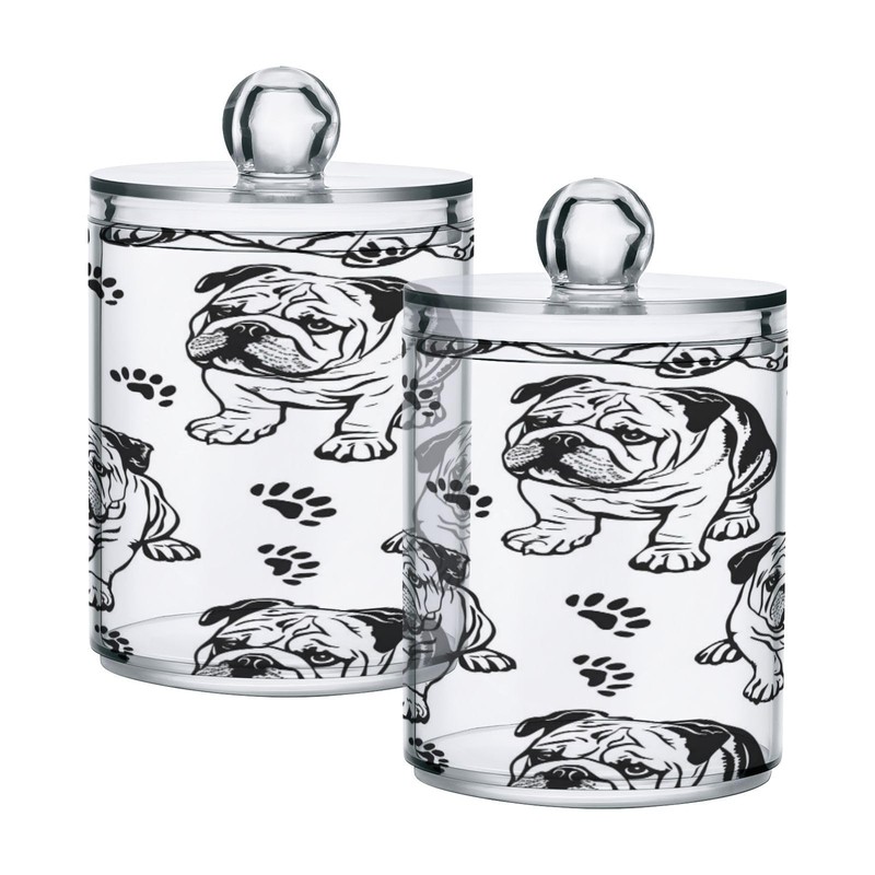 senya Clear Plastic Jars Cotton Swabs Cans, Bulldog Dog Paw Print Bathroom Canisters Storage Organizer with Lids 2PCs Set for Cotton Ball, Cotton Swab, flossers, Hair Bands