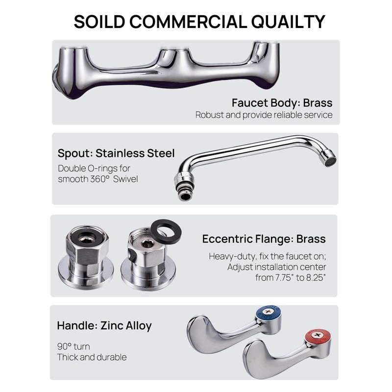 - Easy to Install: The instruction manual is included, no need of a plumber. Simply insert the spout on the faucet and screw the nut on. Install two eccentric flanges and position the commercial faucet into the two 8-inch center distance holes. Install the installation kit(not included) from the backside of the sink or wall, then connect to the water pipes. Tighten all nuts with a simple wrench and enjoy your exceptional kitchen faucet
