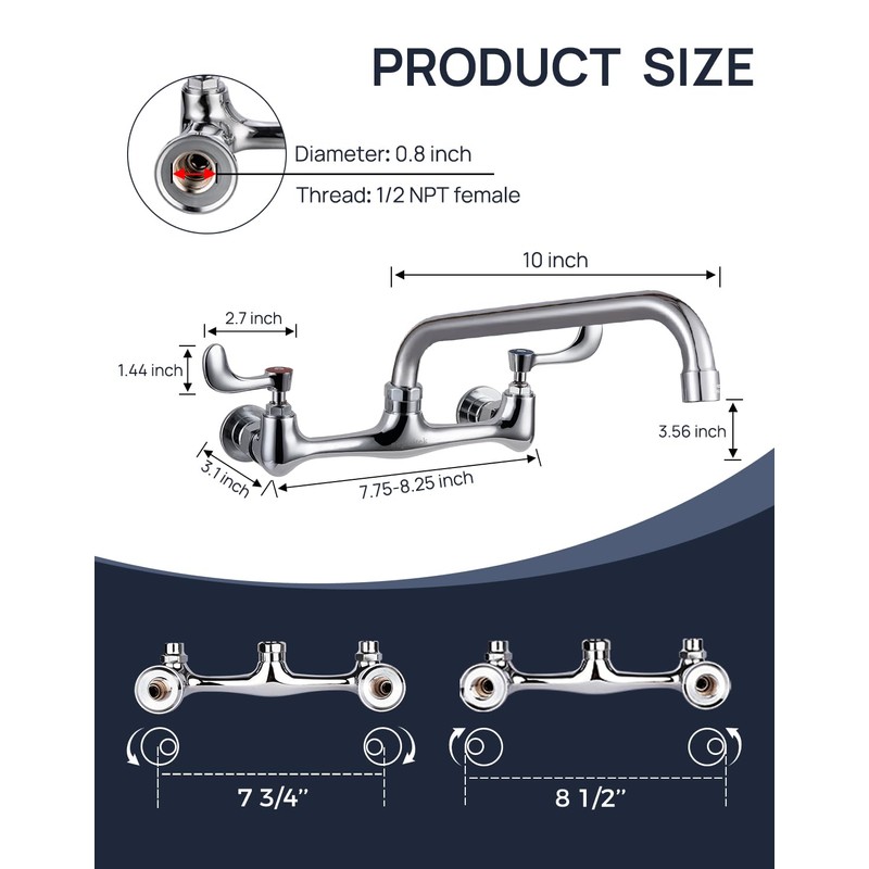 - Easy to Install: The instruction manual is included, no need of a plumber. Simply insert the spout on the faucet and screw the nut on. Install two eccentric flanges and position the commercial faucet into the two 8-inch center distance holes. Install the installation kit(not included) from the backside of the sink or wall, then connect to the water pipes. Tighten all nuts with a simple wrench and enjoy your exceptional kitchen faucet