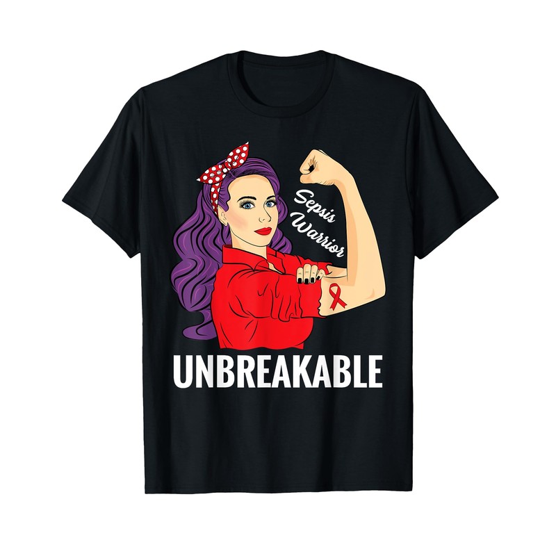 • Sepsis Awareness T-Shirt with Strong Woman, red ribbon, quote Sepsis Warrior Unbreakable. Sepsis Survivor Shirt Gift for women men adult mom dad daughter wife aunt sister grandma fighters on blood disease disorder Raise Awareness Month. Support survivor