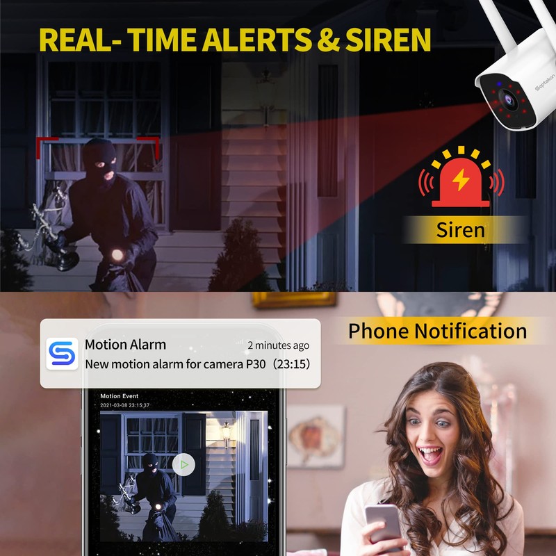 • 【Alarm Siren & Multi-user Access】You can set the camera's automatic siren or sound the siren in case of emergency to scare away uninvited guests. Share the outdoor camera with your family (up to 8 users), protect your home together. Supports RTSP, Onvif and compatible with Alexa.
