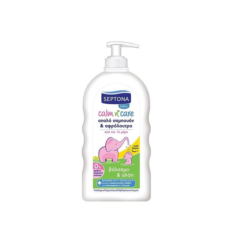 SEPTONA calm n’ care gentle shampoo & bath with hypericum and aloe, is ideal for the daily care of the delicate infant skin, from day 1. Its pure formula with natural moisturising factors, gently cleanses without drying your baby’s hair and skin, while leaving a wonderful baby powder fragrance! Does not cause tears. Natural pH 5.5. Hypoallergenic, Dermatologically, Ophthalmologically and Pediatrically tested. 0% Parabens, Allergens, Alcohol, Soap, Silicones, Dyes.