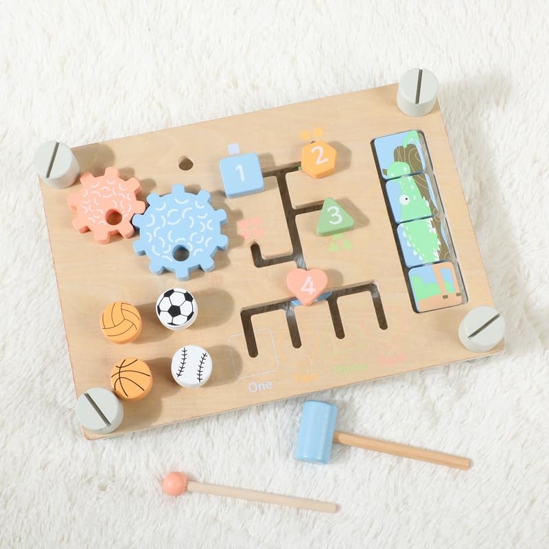 MULTI-FUNCTIONAL DESIGN: Features a xylophone, sliding puzzle, rotating dials, and animal-themed elements all on one wooden board for diverse learning experiences