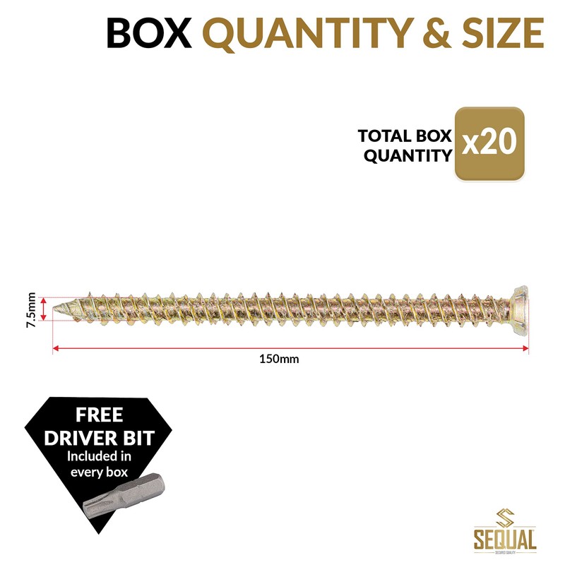 SEQUAL® 150mm (Pack of 20) Easy Drive Countersunk Direct Concrete Screws. No Plugs Needed Concrete Screw Pack Countersunk Screw with Torx Head, T30 Torx Driver Bit Included in Every Screw Pack.