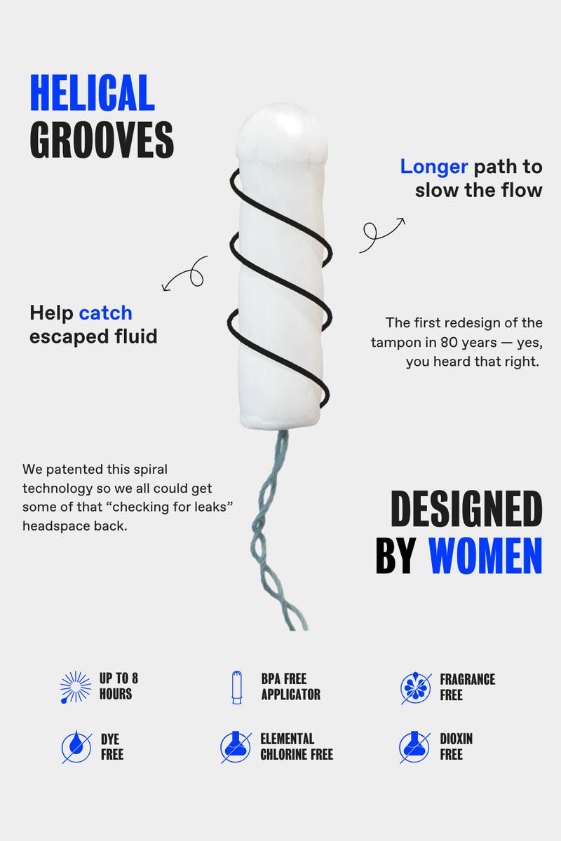 For active women who need a reliable tampon for distraction-free periods. Unlike traditional tampons, this tampon is designed by female athletes and has helical grooves that make the flow path longer to slow the flow. One box of our tampons can support the average person through 2 cycles.