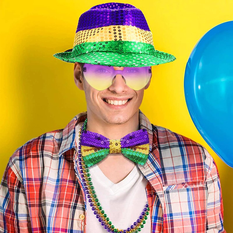 • Package includes:1Pcs Mardi Gras Hat, 1Pcs Mardi Gras bow, 1Pcs Sunglasses will make you look more charming, special and beautiful, charming sequin headwear will add classic sparkle to your clothes and suits.
