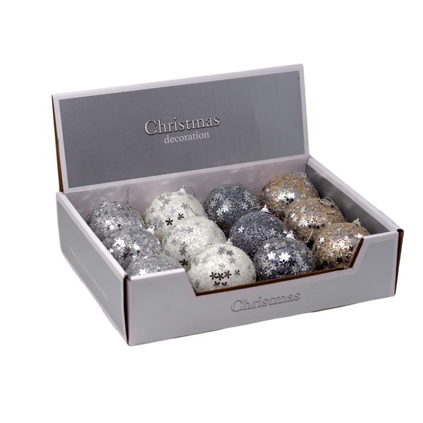 Enhance your Christmas decor with this set of 12 elegant Christmas baubles in a refined silver, white, and champagne color palette. Each bauble is coated with shimmering glitter and decorated with star and snowflake shaped sequins, creating a stunning visual effect as they catch and reflect the light. These lightweight and durable ornaments are easy to hang on your Christmas tree, wreaths, or garlands, adding a touch of festive sparkle to any setting. Packaged in a stylish silver box, this set is perfect for gifting or for safely storing your decorations after the season. Transform your Christmas decor with these timeless, high-quality ornaments that bring a classic, festive charm to any space.