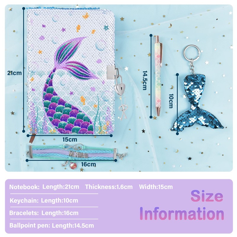Sequins Notebook Set - Sparkly Mermaid Journals for Girls Travel School Office Notepad Memos A5 Diary Notebooks Ballpoint Pen Bracelet Key-chain with Locks and Keys