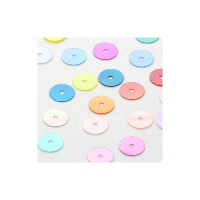 Flat-round spangles (hole in center) featuring 3 tone opaque gradient color Because it is made of PVC, it is not dry clean, but it is cheap, firm and thick. Available in a total of 72 colors (including transparent and metallic types) with only 0.2 inch (6 mm) sizes. The dye lot may have some burring.