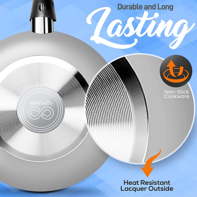 - 15-PIECE SET: The SereneLife Cookware Set features 15pc nonstick cookware set which includes 0.89 & 1.90qt sauce pots w/ lids, 4.70qt dutch oven pot w/ lid, 2.5qt saute pan w/ lid, 8” & 10” fry pans, spoon, spatula, pasta server, ladle, and egg whisk