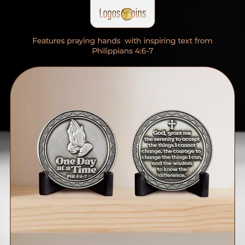 - ENCOURAGING SENTIMENT OF DIVINE PROTECTION: Front: Praying hands, with text, "One Day at a Time". Back: Cross, with text, "God, grant me the serenity to accept the things I cannot change, the courage to change the things I can, and the wisdom to know the difference". Size: 1.25" diameter, 3mm thick.