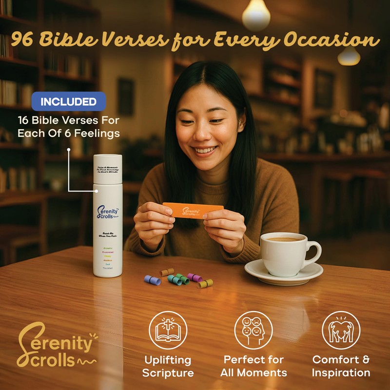 - ππππ πππ ππ ππππ π πππππππππ Serenity Scrolls contain 96 carefully selected Bible verses organized into 6 emotional categories (Grateful, Frustrated, Happy, Anxious, Sad, Troubled) to provide spiritual guidance exactly when you need it most.