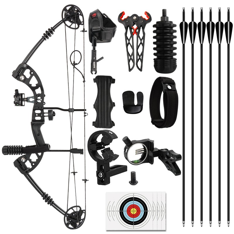 - Package Contents: Compound Bow (1), 5-Pin Sight (1), Bow Release (1), Mixed Carbon Arrows (6), Stabilizer (1), Bow Stand (1), Arrow Rest (1), Finger Guard (1), Wrist Strap (1), Target Paper (6)