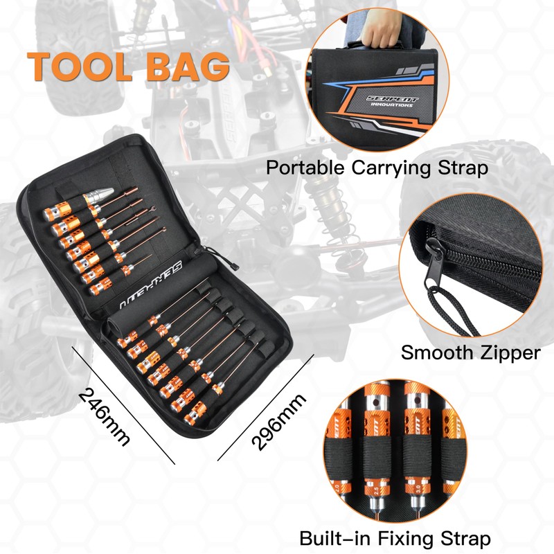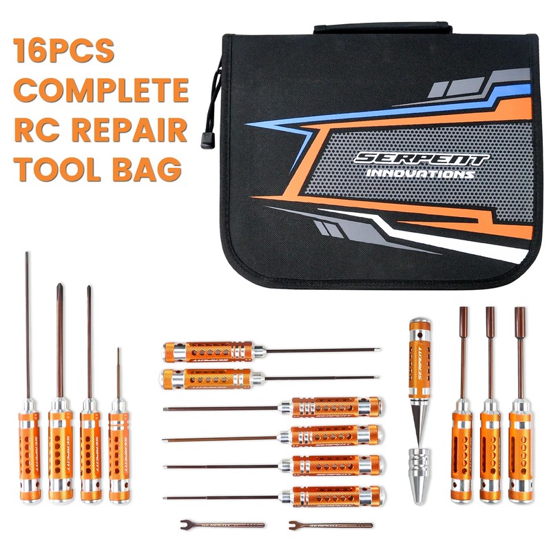 - RC Car Toolset for Offroad Toolkit Serpent 16PCS tool set comes in a great zipper bag . Designated slots in the case help you fix the tool set on the case to avoid falling off or slipping,keep your tools conveniently organized and in reach on the job. Not only easy to organize and store tools, but also easy to carry.can be given as a gift to friends who like remote control models.