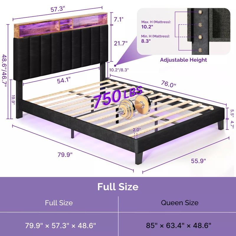 Sersper Full/Queen Size Bed Frame with Storage Headboard, Charging Station & LED - Full, Black