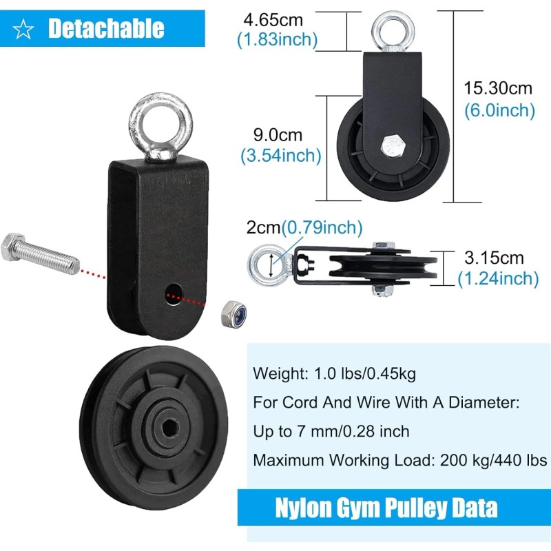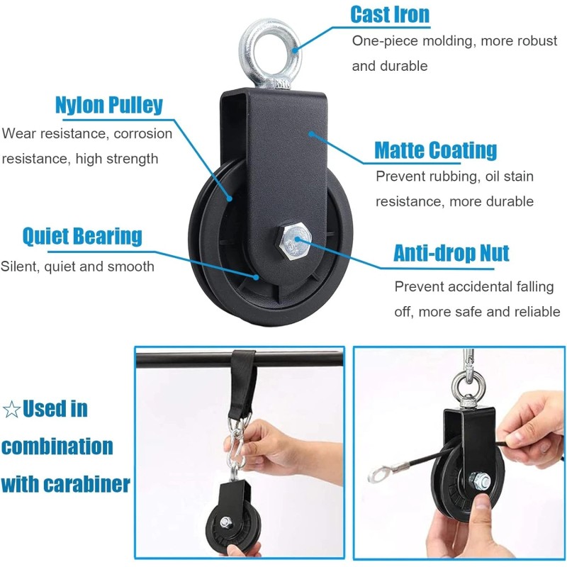 - 【HIGH QUALITY Powerful Gym Pulley】Weight Cable Pulley is made of Premium carbon steel ball bearings and Nylon wheels, Carbon steel ball bearings not only enhance the bearing capacity of the pulley, but also reduce friction and better protect the nylon pulley wheel from wear, making the pulley sturdy, wear-resistant and smooth running. ideal material cable pulley attachments for gym.