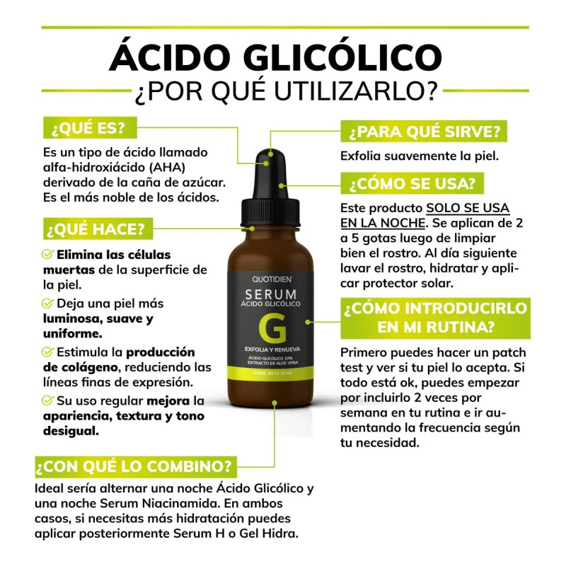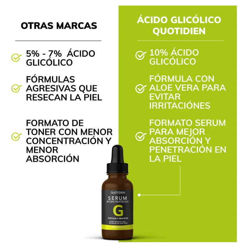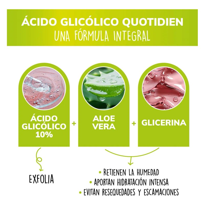 Serum Acido Glicolico 10% Quotidien + Aloe Vera + Glicerina | Exfoliación Efectiva | Antienvejecimiento | Líneas De Expresión | Ideal Todo Tipo De Piel - 30ml