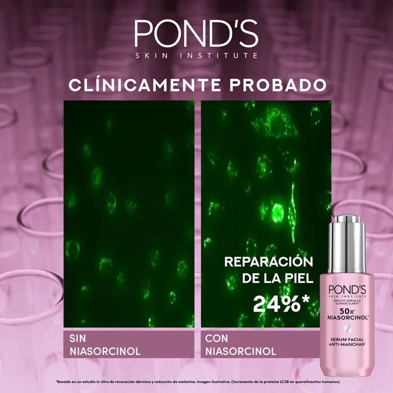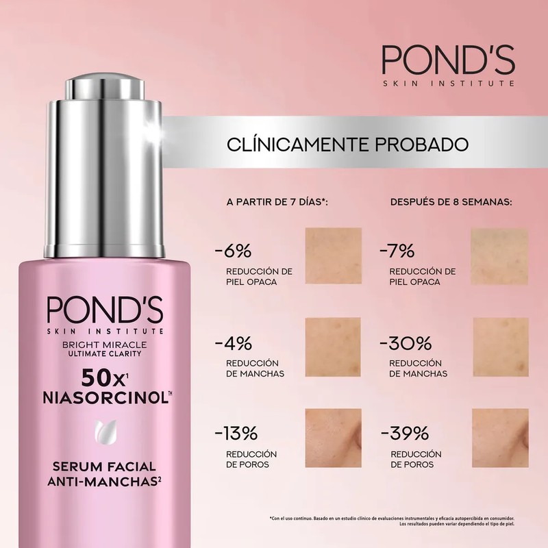 Ilumina y unifica tu piel con el Sérum Facial Pond's Bright Miracle ✨. Con su complejo Niasorcinol, este sérum reduce manchas y marcas para un cutis radiante y con tono uniforme.