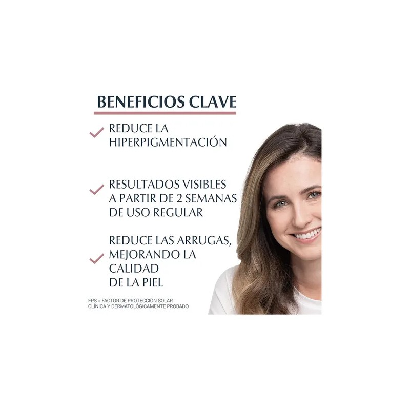 Beneficios:: | Reduce manchas, previene su reaparición, suaviza líneas de expresión y arrugas, unifica el tono de piel, aporta una apariencia más joven |