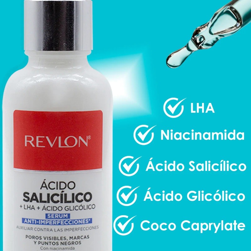 ✨ REVLON Sérum Facial Ácido Salicílico 3% LHA+Niacinamida 30ml 🔬 Sérum anti-imperfecciones concentrado para Todo Tipo de Piel. Con 3% Ácido Salicílico, LHA y Niacinamida, reduce el acné, poros visibles y marcas. Exfolia suavemente, controla el sebo y mejora la textura y tono de la piel. ¡Uso Día/Noche, hipoalergénico y libre de parabenos para un cutis impecable!