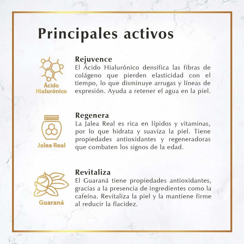- FÓRMULA. Hecho con 98% de ingredientes naturales. El Ácido Hialurónico hidrata y reduce la apariencia de las arrugas. La Jalea Real nutre y repara a profundidad. El Guaraná tiene altas dosis de antioxidantes que revitalizan y reafirman la piel.