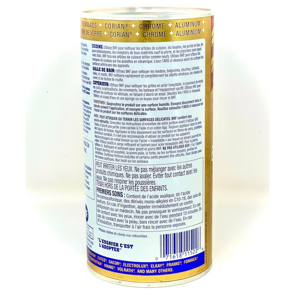 This Bar Keepers Friend Cleanser and Polish is the premium household powdered cleanser with a non-bleach formula. BKF is recommended for cleaning stainless steel cookware and sinks, glass and ceramic cook-tops, solid surface countertops, porcelain and acrylic bathtubs and more. It's a perfect cleaner for removing rust, tarnish, hard water stains and lime scale.