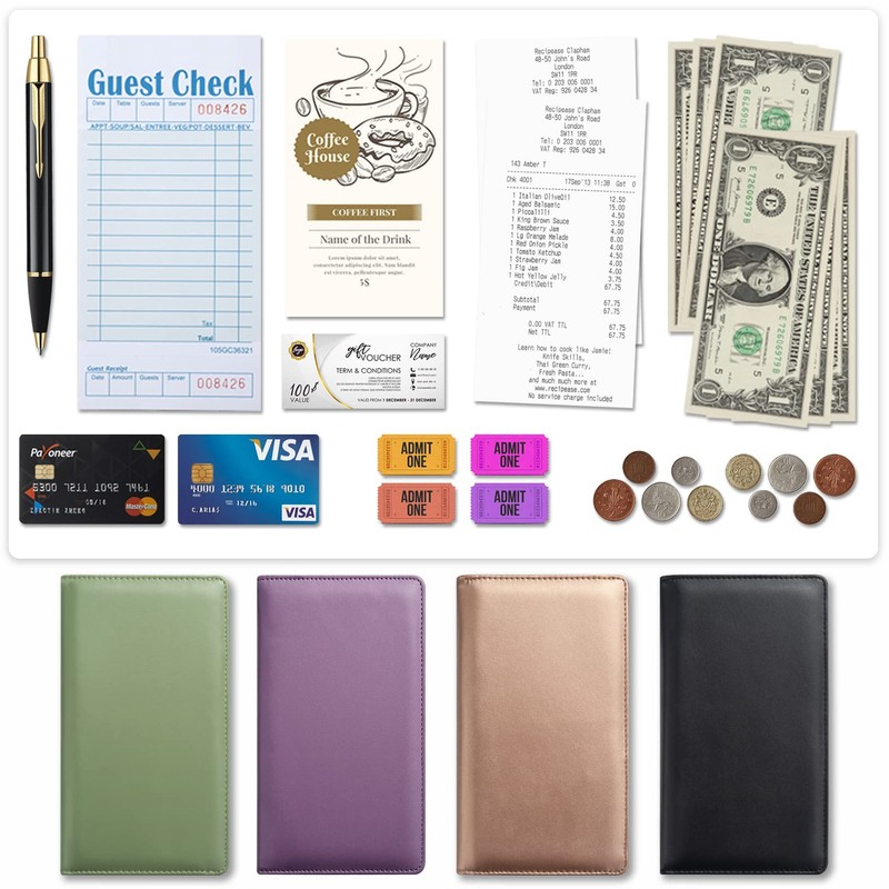 - Smart Storage & Quick Lookup: 10 multi-functional compartments. On the right side has a Guest check pad, and on the other has a Money Pocket, Tickets Pocket and Credit Card Slot. Two small clear pockets can store bills, receipts and other items to be viewed. A stitched pen loop to store your favorite pen.