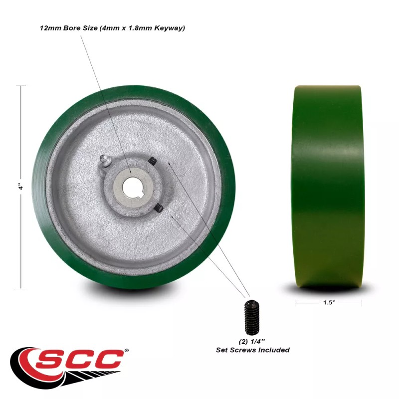 When searching for a reliable and durable solution for replacement keyed drive wheels, consider Service Caster’s Polyurethane on Cast Iron wheels. Polyurethane on cast iron is the most versatile and cost-effective industrial wheel on the market. Service Caster’s polyurethane tread is liquid cast and chemically bonded to a Class 30 solid web cast iron center. The non-marking and non-sparking tread protects floors, rolls quiet and is resistant to most chemicals, while the high capacity load bearing wears like iron. Featuring a green polyurethane tread and a silver cast iron core, this keyed drive wheel comes with a 12mm plain bore and a 4mm x 1.8mm keyway. This wheel also comes standard with (2) 1/4" set screws, one on the keyway and one 90 degrees from it. Finally, featuring a 90-95 Shore (A) durometer, this wheel is a great option for anyone looking for a keyed drive wheel. If you do not see the needed size listed, please contact us so we can assist you further. Service Caster is unsurpassed in quality, reliability, and excellent customer service. Count on us to move you forward.