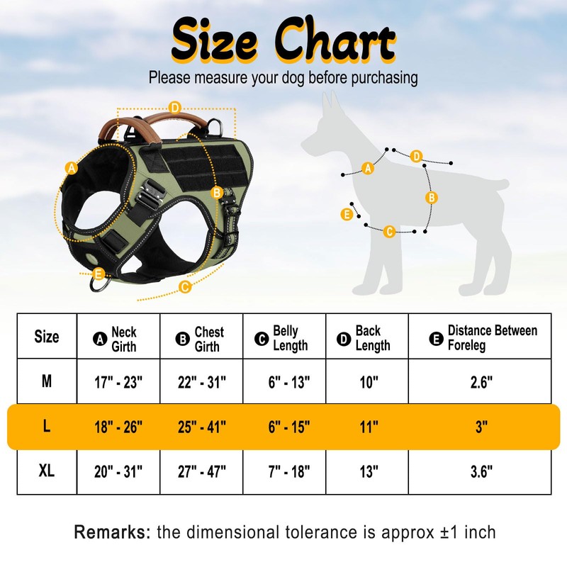 - [Dog Harness for Medium Large Dogs] - A professional tactical dog harness has 5 adjustment locations to allowing you to achieve a secure and comfortable fit for your dog's body shape. Neck Girth: 18”- 26” (47 - 66cm), Chest Girth: 25”- 41” (64 - 103cm), Back Length: 11”(28.5cm).Please refer to our size chart, make sure match up your dog's measurement