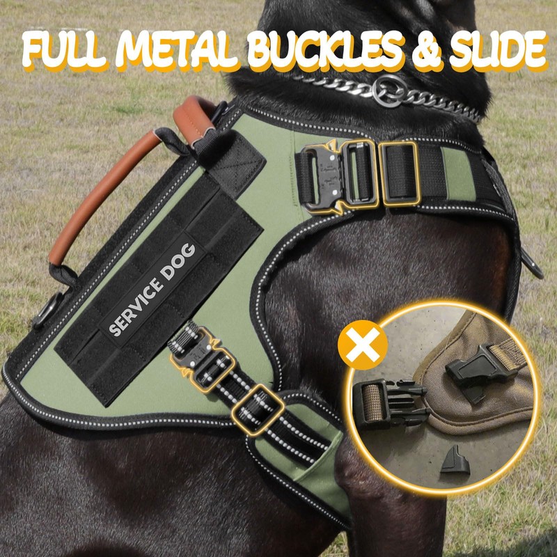 - [FULL Metal Buckles] - HEYCAHVA tactical dog harness with Full sturdy metal design replaces easier broke plastic buckles, withstand great pulling force to lock down fitting. Sewing by double reinforced stitching on each joint and heavy load point, which ensures longevity and withstands rough usage. Ideal for medium or large breeds, such as Bulldog, Huskies, Labrador, Alaska, German Shepherd, Pittie, Golden retriever, Doberman, etc.
