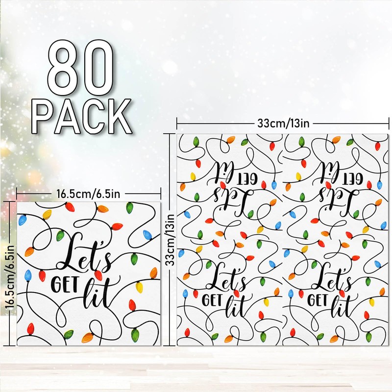 80 servilletas de cena temáticas de Navidad diseñadas con coloridas luces de Navidad, son una gran opción como suministros de fiesta para la cantidad suficiente y naturaleza decorativa.