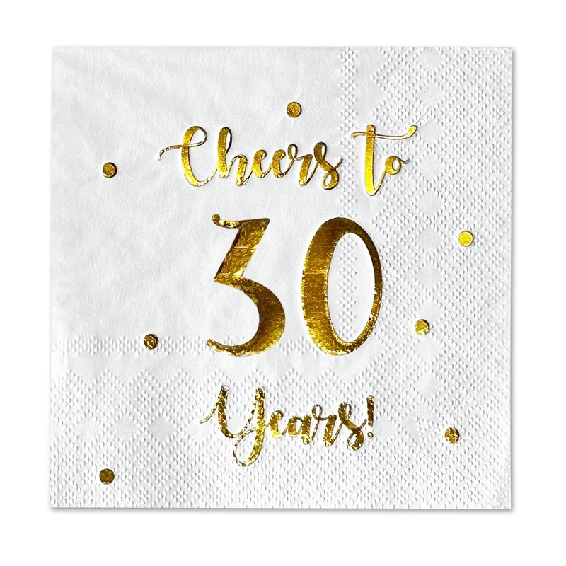 - El juego incluye: 50 servilletas de papel blanco de alta calidad con texto clásico "Cheers to 30 years" y puntos. Las celebraciones de 30 años suceden una vez en la vida, celebrarlas con buen gusto!