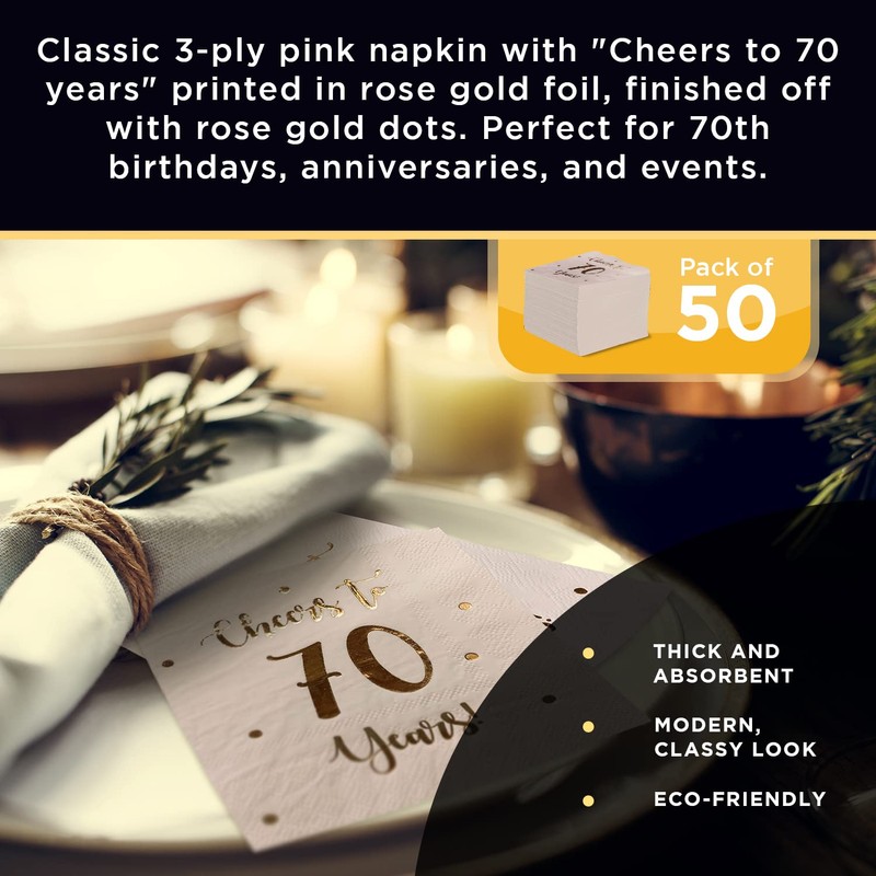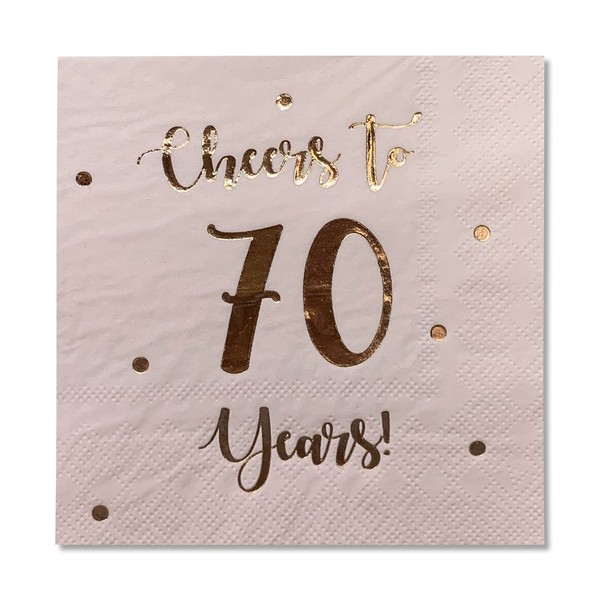 - El juego incluye: 50 servilletas de papel rosa de alta calidad con texto y puntos clásicos "Cheers to 70 years" en lámina de oro rosa y puntos. Las celebraciones de 70 años ocurren una vez en la vida, celebra con buen gusto