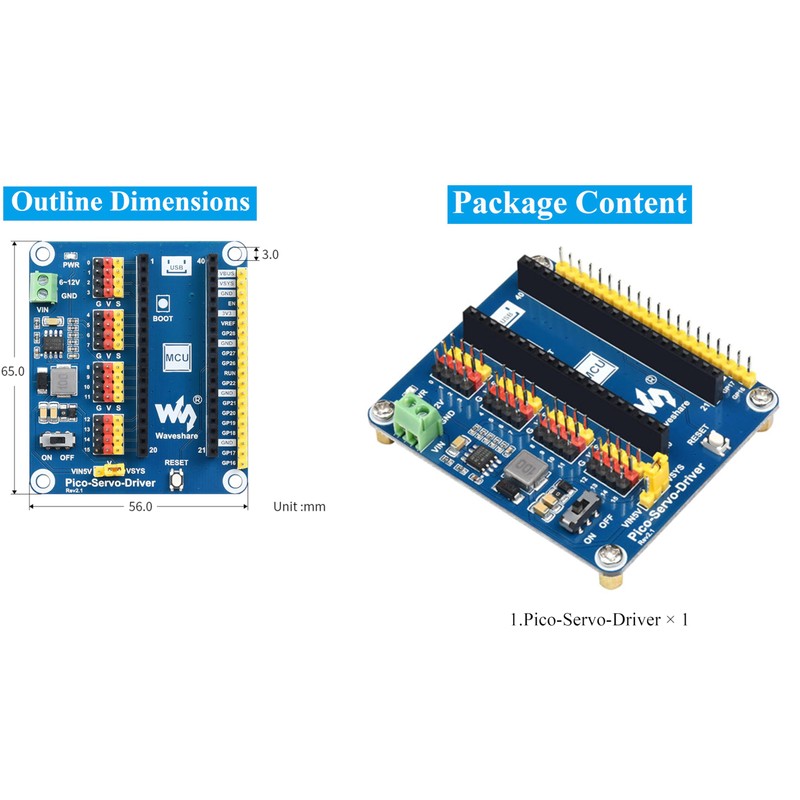 • Servo Driver Module with Standard Pi Pico header, compatible with Raspberry Pi Pico 2W/2/Pico W/Pico. Exposes unused pins of Pico, easy expansion.