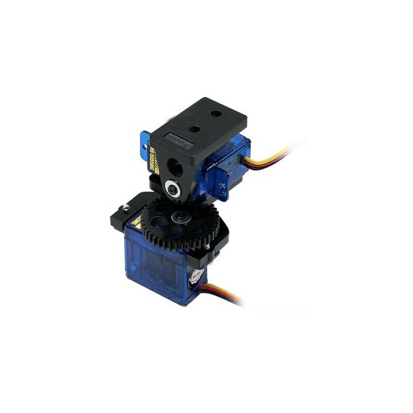 ServoCity introduces the ServoCity SPT50 Sub-Micro Pan Tilt Kit (No Servos). Looking to mount a micro camera to a park-flyer airplane or a small robot, the SPT50 is the unit you need. The pan utilizes 48 pitch gears with a 2:1 ratio to overdrive the pan shaft for 180°+ rotation. The tilt offers 90°+ degrees of motion. Assembly only takes 5 minutes. The SPT50 works with HS-55 Micro Servo Motor and HS-5055MG servos. The height is approximately 2.1" and the width at the widest point is approx 1.8"