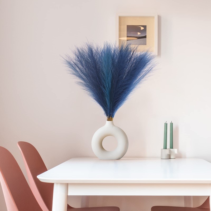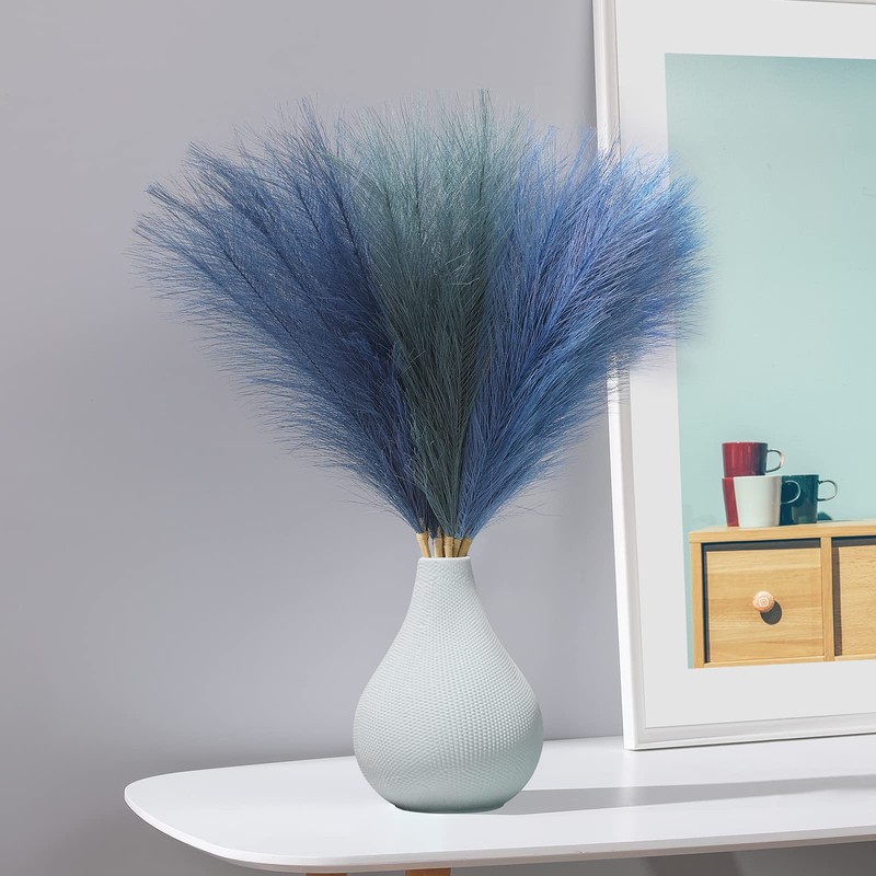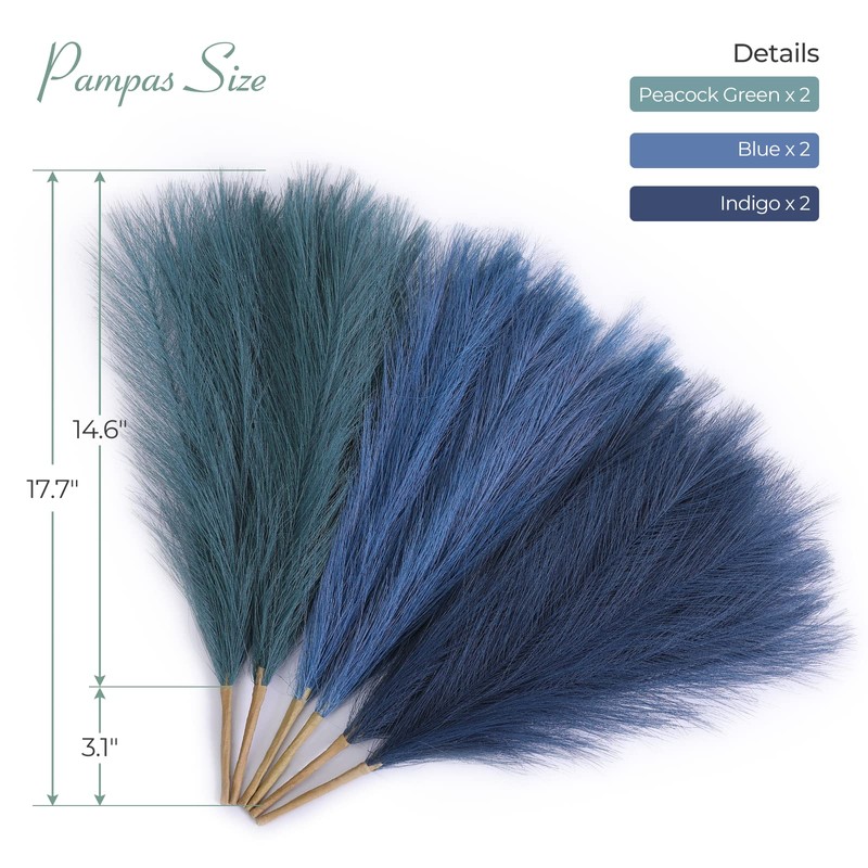 - Blue & Green Pampas Grass Decor- This faux pampas grass set includes 2 stems of blue, 2 stems of indigo and 2 stems of peacock green. The stylish and fluffy gradient feather can add a romantic feeling to your home or event. Let’s create your own chic space!