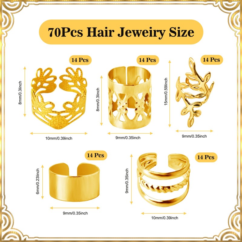- 【Unique Design For Standout Hairstyles】This 70-piece hair jewelry set features 5 distinctive designs to transform your hairstyle and add flair to braids and twists.Each piece is meticulously crafted to give you a unique hairstyle that will make you look great for any occasion.
