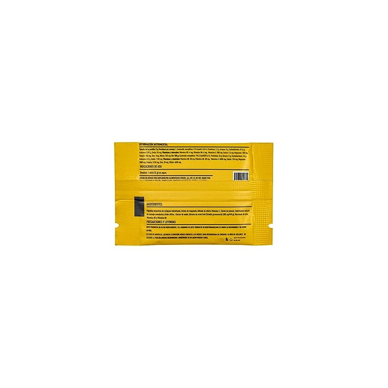• mandarina, Ácido cítrico, Cloruro de sodio, Sucralosa (240 mg/100 g), Gluconato de zinc, Vitamina B5 y Vitamina B6 Modo de uso: 1 stick (5 g) diario en agua. Precauciones: No exceder la porción máxima recomendada.