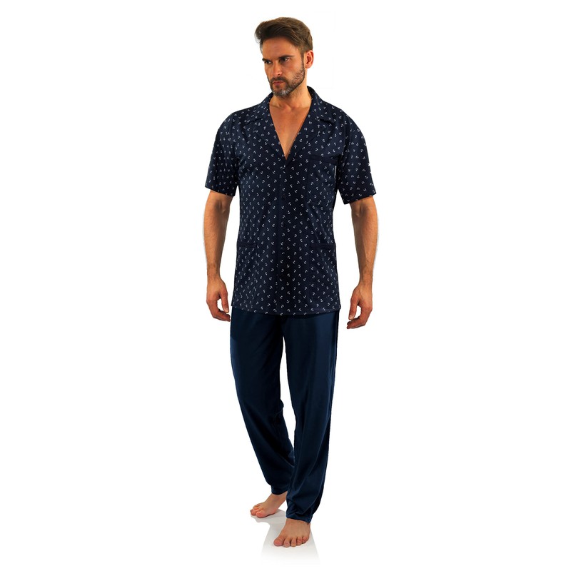 Short sleeve shirt with button closure has V-neck, one left chest pocket and two side pockets. The long pyjama bottoms have an elastic waistband.