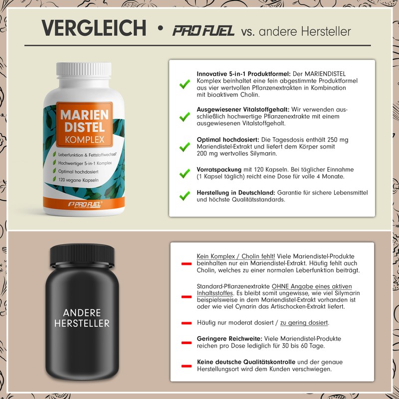 - 🏆 MARIENDISTEL KOMPLEX: Der MARIENDISTEL Komplex beinhaltet eine innovative 5-fach-Produktformel mit vier hochwertigen Pflanzenextrakten und bioaktivem Cholin. Die fein abgestimmte Kombination aus Mariendistel, Artischocke, Löwenzahn und Desmodium (Bettlerkraut) versorgt den Körper gezielt mit sekundären Pflanzenstoffen und wertvollen Bitterstoffen.