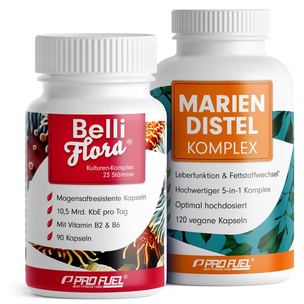 Set: Mariendistel Komplex + BelliFlora® Kulturen-Komplex - 120x Mariendistel-Kapseln mit Artischocke, Löwenzahn, Desmodium & Cholin + 90x BelliFlora® Kapseln mit 23 wertvollen Bakterienstämmen