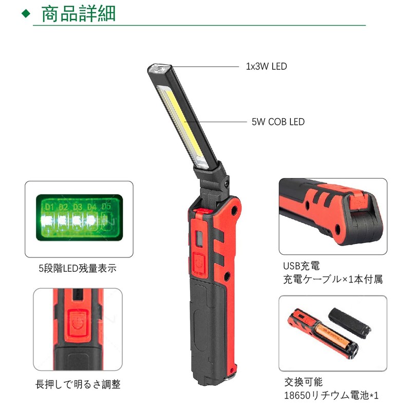 - Multi-functional Work Light: Equipped with a 3W LED direct bulb on the top to illuminate dark corners as a spotlight. The main light is 5W COB LED, which illuminates a wider area