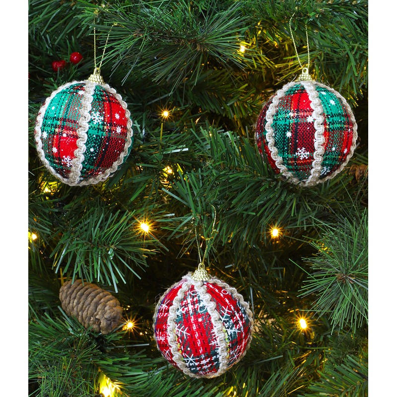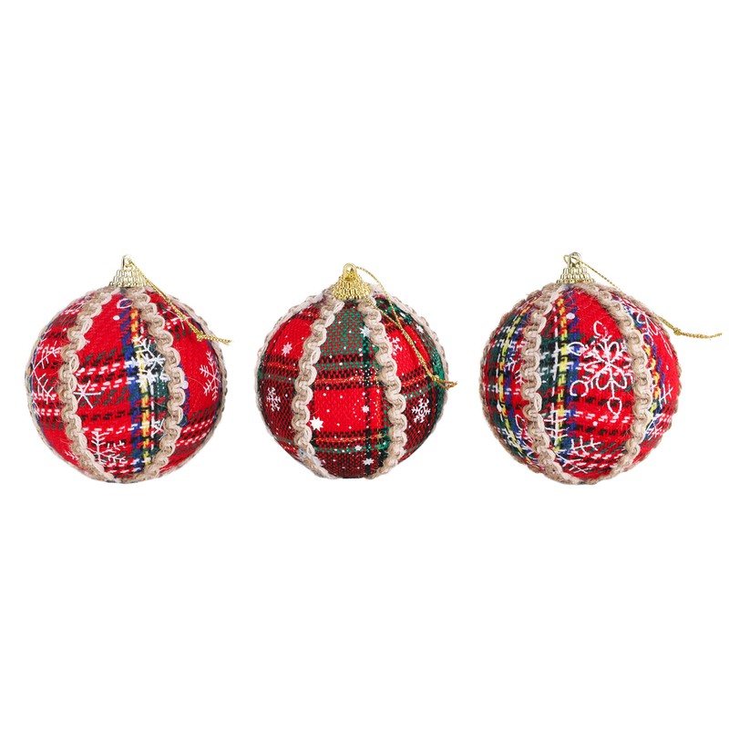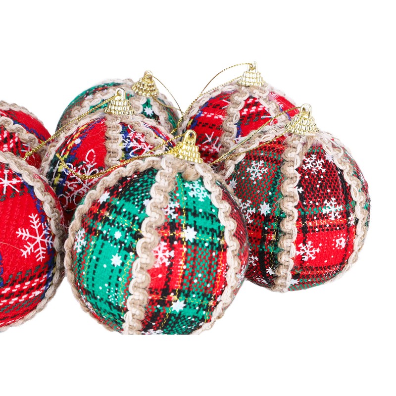 Set of 12 Christmas Baubles - Red Tartan with Cream and Black Decoration