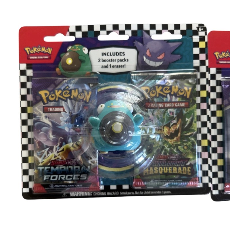 The product is a set of 2 sealed boxes containing 2024 Back To School Eraser Blister cards featuring the Pokémon characters Gengar and Bellibolt. Manufactured by Nintendo as part of the Pokémon TCG set Twilight Masquerade, these English-language cards are in standard size and come in a booster configuration. Perfect for collectors of CCG sealed boxes, this set offers a unique addition to any Pokémon TCG collection with the inclusion of iconic characters like Gengar and Bellibolt.