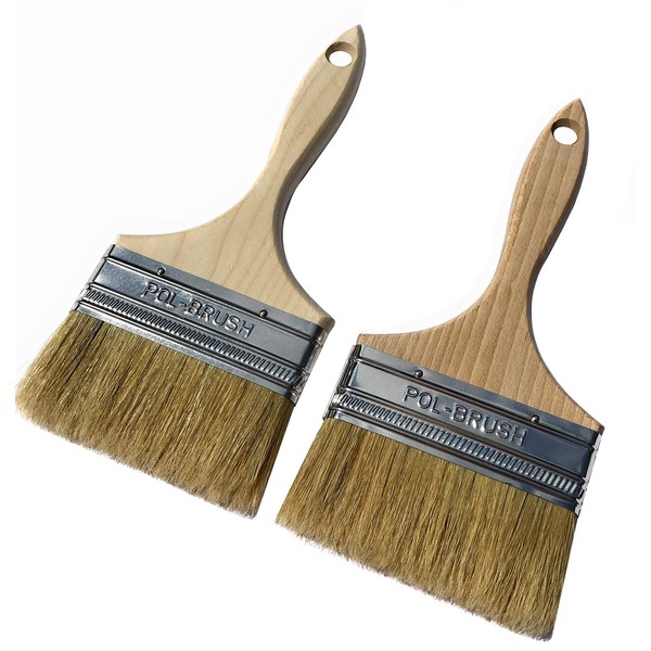 Set of 2 4 inch European Professional Paint Brushes - Natural Bristles/Wood Handle - for Paint with Acrylic, Chalk, Oil Based, Latex, Stain, Watercolor, Wax, Varnish and etc Paints.