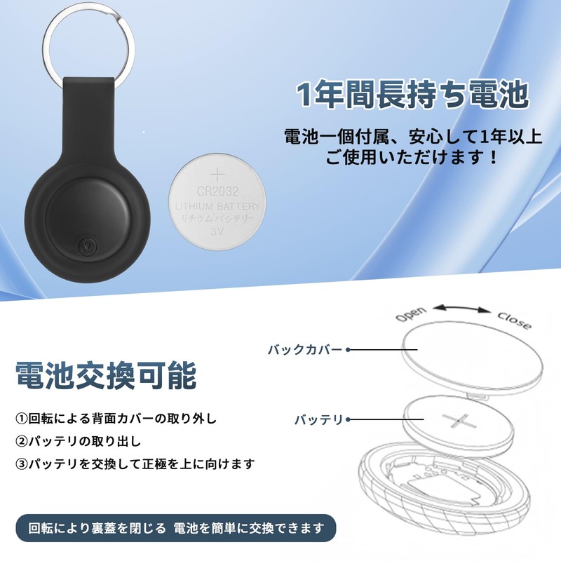 - Replaceable Battery & Ultra Lightweight 0.2 oz (7 g); This smart tag is replaceable with batteries, so it can be used without charging, and it will last a long time. You can check the remaining battery level from the app, and it is compatible with CR2032 button type batteries. Compact anti-lost tracker is approximately 1.2 inches (3 cm) and weighs 0.2 oz (7 g). Not only is it comfortable to touch, it also can withstand splashes and rain, it is oil-proof, wear-proof, shock-proof, and comes with a high quality protective case with iron ring. (In addition to the built-in battery in the product itself, it also comes with an additional battery so you can use it for a long time without worry