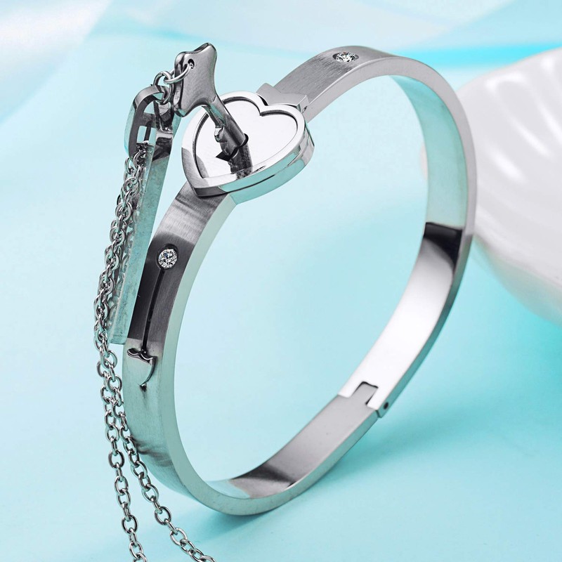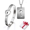 Set of 2 Bangle with Lock & Pendant Chain Key Set for Couples, Stainless Steel Heart Lock Bracelet Bracelets, Jewellery Women's Men's Necklace Chains for Couple Partner Friendship BFF Gift